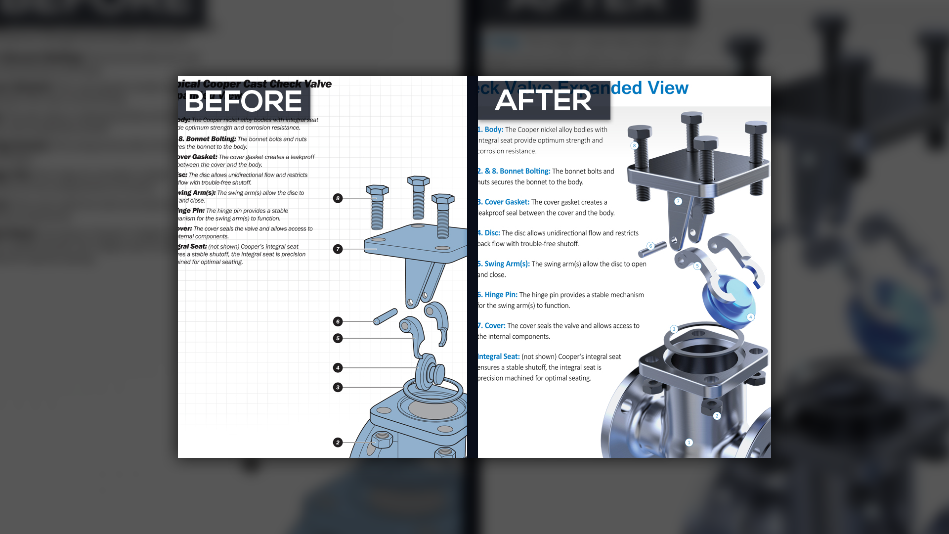 Cooper Valves was thrilled with the results, as the refreshed catalogs helped them stand out among competitors. The blueprint branding concept quickly became a recognizable industry standard, and the new 3D visuals influenced other companies to rethink their marketing materials.
