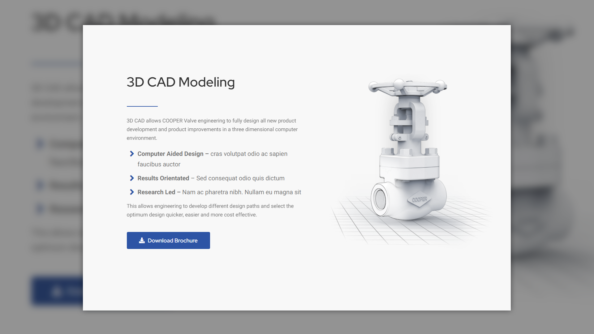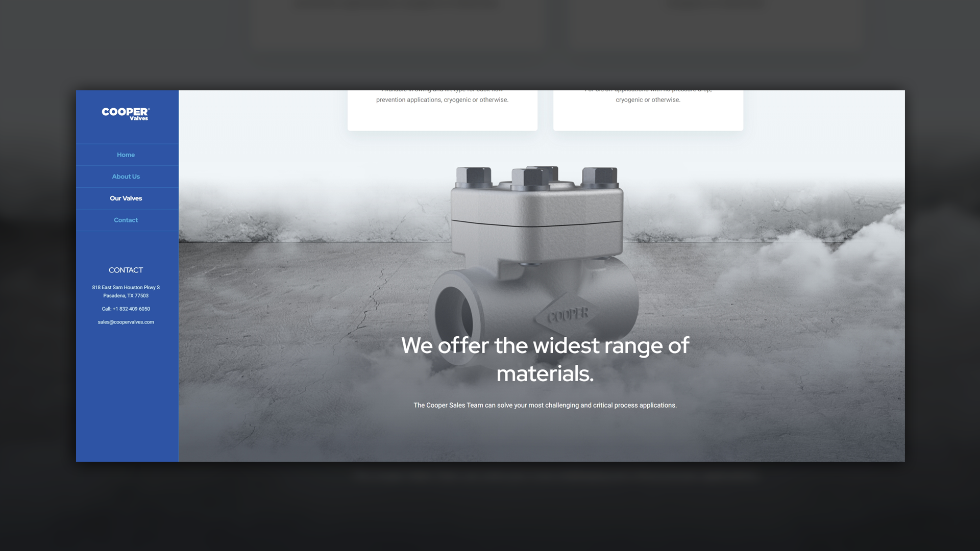To address these challenges, we crafted a website that balances visual impact with technical clarity. The animated GIF header draws attention without overwhelming the interface, while the intuitive product pages ensure ease of use for engineers and procurement teams. Our on-demand creative services allowed us to fine-tune every design element, ensuring a cohesive and professional result. By working closely with Cooper Valves' leadership, we aligned the website with their vision, keeping the brand’s American presence strong while modernizing its digital footprint.