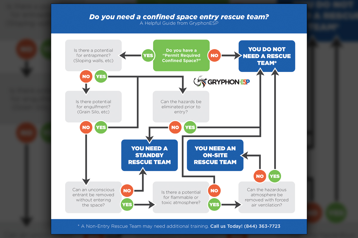 The confined space entry rescue flowchart for GryphonESP was designed to follow brand colors while ensuring each decision step is quickly understandable at a glance by safety teams.