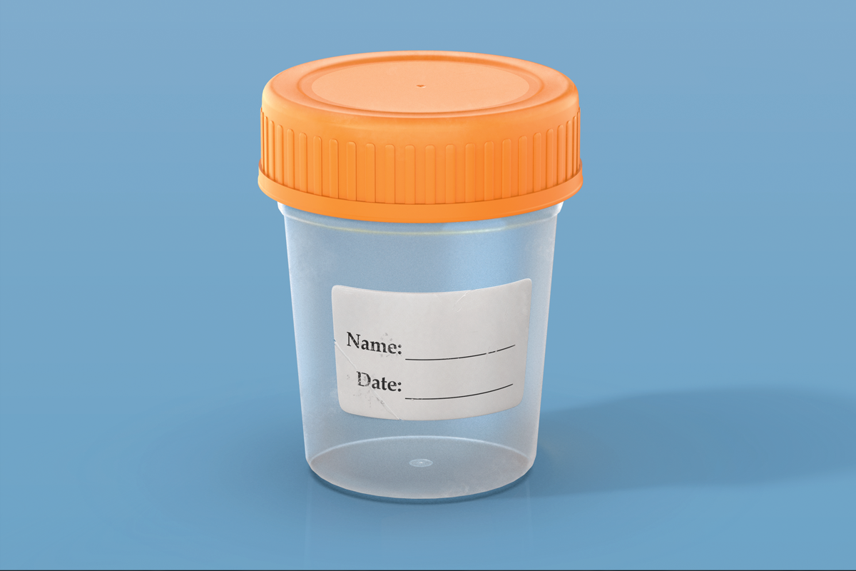 The drug testing cup render leans into recognizable imagery with a clear cap, soft plastic body, and a label carrying tiny creases and ink smudges. The intentional imperfections highlight the aging nature of urine testing and set up the pivot toward hair testing, which supports the message.