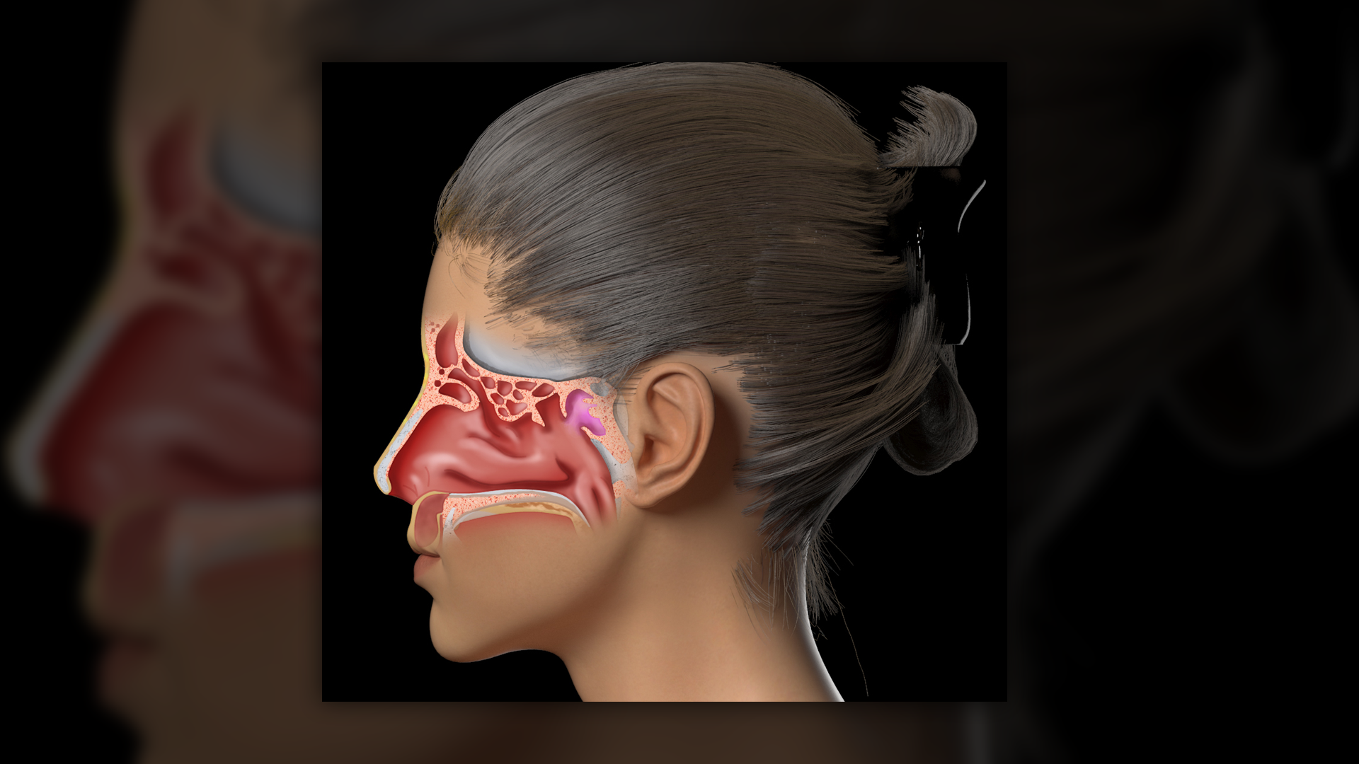 The main challenge was achieving a realistic and educationally useful representation of sinus anatomy. The need to depict fluid buildup and post-surgical corrections accurately required multiple iterations and expert feedback. Additionally, integrating 2D illustrations with 3D renderings demanded meticulous attention to detail to maintain a natural and professional look.